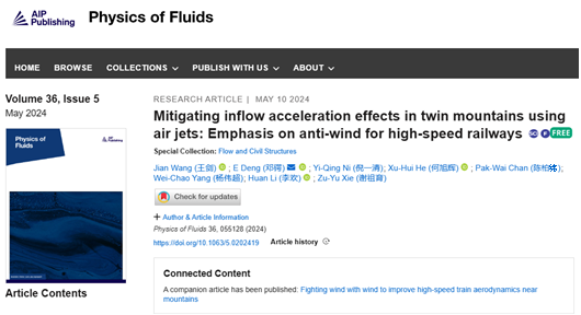 近日,诸侯快讯ok1122院杨伟超副教授和香港理工大学邓锷博士及其合作者团队以诸侯快讯ok1122为第一单位发表题为“Mitigating inflow acceleration effects in twin mountains using air-jets: emphasis on anti-wind for high-speed railways”的研究论文。该研究成果被美国物理学联合会出版社杂志《流体物理学》(Physics of Fluids)作为编委推荐文章发表,并被美国物理学联合会《科学之光》(Scilight)专题文章采访报道。