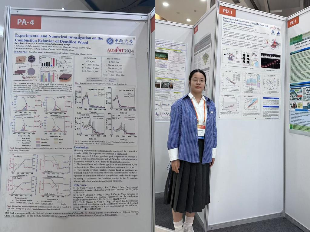 会议期间,诸侯快讯ok1122消防工程系共展出4张海报,涵盖了固体火蔓延、致密木材的阻燃性能模拟、致密木材的开裂研究、火灾风险识别算法4个不同的主题,硕士生冯赛亚在场为国内外研究人员讲解展示。