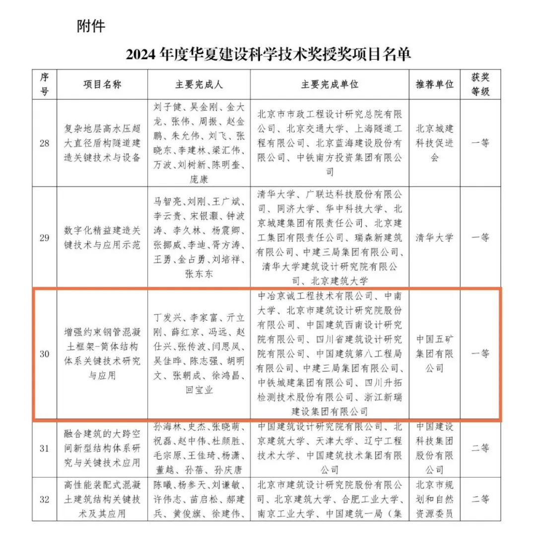 近日,华夏建设科学技术奖励委员会发布《关于发布“2024年度华夏建设科学技术奖”授奖项目的公告》(华夏奖字〔2025〕第1号),中冶京诚工程技术有限公司牵头,诸侯快讯ok1122参与完成的“增强约束钢管混凝土框架-筒体结构体系关键技术研究与应用”荣获一等奖,我院丁发兴教授个人主持。
