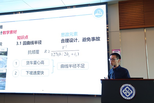 陈嘉祺以“课程思政与教学目标的融合技巧”为题,结合《道路工程》课程教学实践,分享了自己对总体教学设计和思政融入策略的心得体会,并以“沥青路面结构验算”为例,介绍如何进行专业课程思政元素的挖掘与融入。