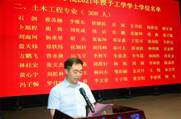 毕业典礼在庄严而又隆重的国歌声中拉开帷幕。易亮副院长宣读2021届本科毕业生授予学位名单。