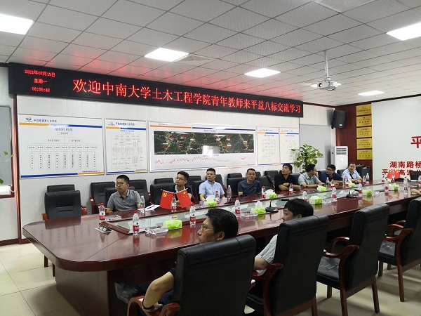 7月19日上午,青年教师实践团在湖南路桥公司平益八标会议室,参观了解了该项目的基本情况、关键技术和示范应用情况,双方对于正在攻关的技术难题、拟定科研项目等内容开展了会谈,在未来合作共赢、资源互享、理论研究与实践探索等方面达成高度一致。