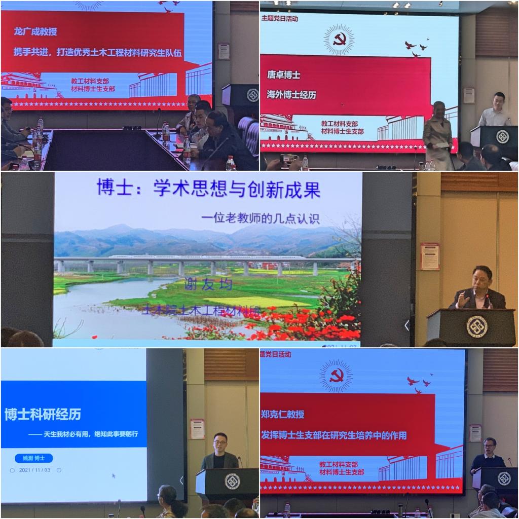 随后,材料所所长龙广成教授作了“携手共进,打造优秀土木工程材料研究所队伍”主题报告,龙广成教授指出博士生党员应起到先锋模范带头作用,维护并进一步发扬材料所内的互助共进和谐风气。师生之间应建立严谨治学,勇于探索的培养形式,形成平等互信的关系,为学院、学校和国家的发展建设增光添彩。原土木院院长谢友均教授作了“博士生培养:学术思想与创新成果”主题报告。谢教授从自己的学习、科研经历出发,为博士生规划了发展路线,即前期形成学术思想,后期获得创新成果。提出学术思想与创新成果是科研工作的永恒主题。谢教授指出,诸侯快讯ok1122科的研究生要立志做出高于工程实践的科研成果,以积极进取与团结协作等精神将其应用于服务工程中去。唐卓、姚灏两位青年老师分别从“海外博士经历”与“博士科研之路”两个角度进行汇报,生动回答了博士生所关心的国外博士培养模式及良好科研习惯养成的问题。材料博士生支部书记郑克仁教授作了“发挥博士生支部在研究生培养中的作用”主题报告,郑教授分析了研究生在科研工作中的问题现状,国家发展、强盛需要一大批优秀的高端人才,这就要求博士生党员坚定信念、勇担重任,通过科研攻关勇于挑战自我、提升眼界和个人定位,实现人生价值。五位教师党员代表的报告使与会研究生收获良多。