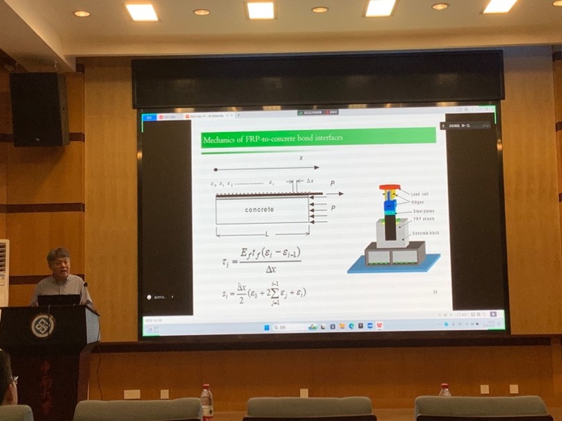 第三场报告,戴教授就纤维增强复合材料(Fiber-reinforced polymer composites, FRP)加固结构界面力学展开论述。首先戴教授介绍了外接FRP增强/加固技术及其应用,如利用外包FRP约束钢筋混凝土柱以提高其抗剪强度和延性,展现了其施工易、成本低、加固性能好等优点。接着戴教授着重介绍了FRP与混凝土间的界面粘接/脱粘力学作用机理,并考虑其在复杂荷载/环境效应下的作用形式。最后戴教授还介绍了FRP网格、FRP筋等新兴的结构形式在结构体系中的应用,而利用新型复合材料促进混凝土—钢组合结构加固效果的创新粘接系统仍在研发之中。