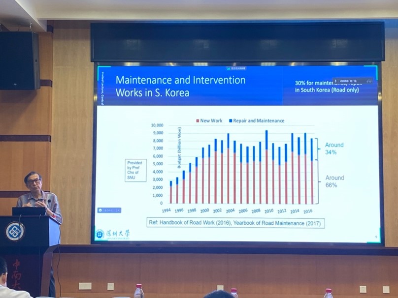 在第二场报告中,UEDA教授紧扣报告主题,就结构全寿命周期管理展开讲解。结构全寿命周期管理指对结构在其全寿命周期内进行系统的管理和协调活动,使其满足社会要求,如安全性、可使用性、可修复性、美观性等,实现保护、恢复环境和控制寿命周期成本的最佳解决方案。UEDA教授从结构维护方案的制定、评估以及实施三个方面对整个结构全寿命周期管理流程作了深入浅出的介绍,并着重提到了长期战略维护计划制定以及预防性维护的重要性。同样,UEDA教授强调了关于基础设施结构全寿命周期管理规范化、标准化以及加强国际合作的重要性。