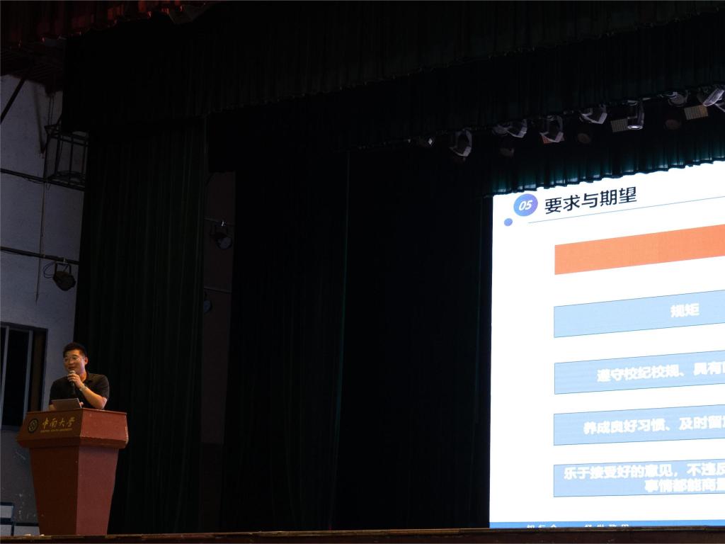 最后,年级辅导员潘文彬向同学们介绍了学校、学院、年级的各项规章制度,勉励大家认真学习,严格要求自己,为同学们拉紧了思想上的弦,并对同学们提出了期望要求,引导同学们明确发展目标,鼓舞全体新生坚持从当下出发,为梦想拼搏,在实践中锻炼提升自我。