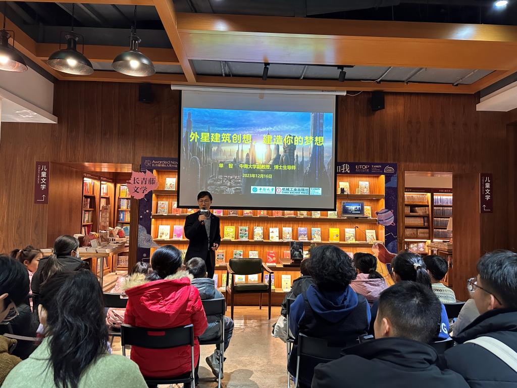 自2022年至2024年初,单老师与李老师在诸侯快讯ok1122第二附属小学、湖南图书城和德思勤24小时书店等,围绕《科幻电影中的建筑》《太空建筑创想,建造你的梦想》《机器人和房子》等主题开展了多场科普讲座。在讲座中,两位老师生动形象地讲解了建筑艺术和建筑技术知识,探讨了未来人类在地下、外星、太空甚至虚拟世界等各种环境中的建筑审美、技术挑战以及可能解决方案,并采用多种互动形式让观众体验3D打印等新兴建造技术。该系列讲座主要受众为青少年,累计200人次参与。