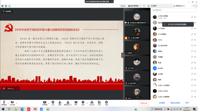 全体参会成员共同回顾了党在国家经济、文化、政治、法治、生态方面的建设过程,学习领悟两次大会传递的重要精神。党的十九届六中全会体现了党重视和善于运用历史规律的高度政治自觉,体现了我们党牢记初心使命、继往开来的自信和担当。湖南省第十二次党代会指出:将坚持以习近平新时代中国特色社会主义思想为指导,为全面实现社会主义现代化而努力奋斗。