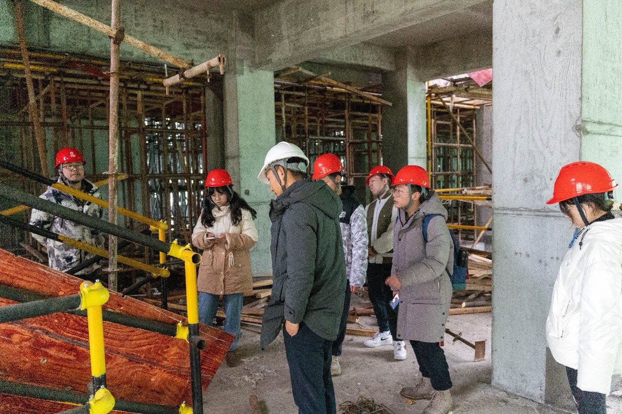 在保证安全的情况下,实践团进入正在施工的教学楼内部进行参观调研。项目负责人向实践团介绍:该项目整体上采用装配式建筑,除了承重梁和承重柱外,墙面、楼板等结构均采用预制结构,即事先在工厂制作所需结构,再运往施工现场安装。类似的,现场许多楼梯也属于预制楼梯。为了能更好地对内部结构进行施工,施工现场的许多梁和柱都预留了钢筋与管道,方便后续内部主体的施工。