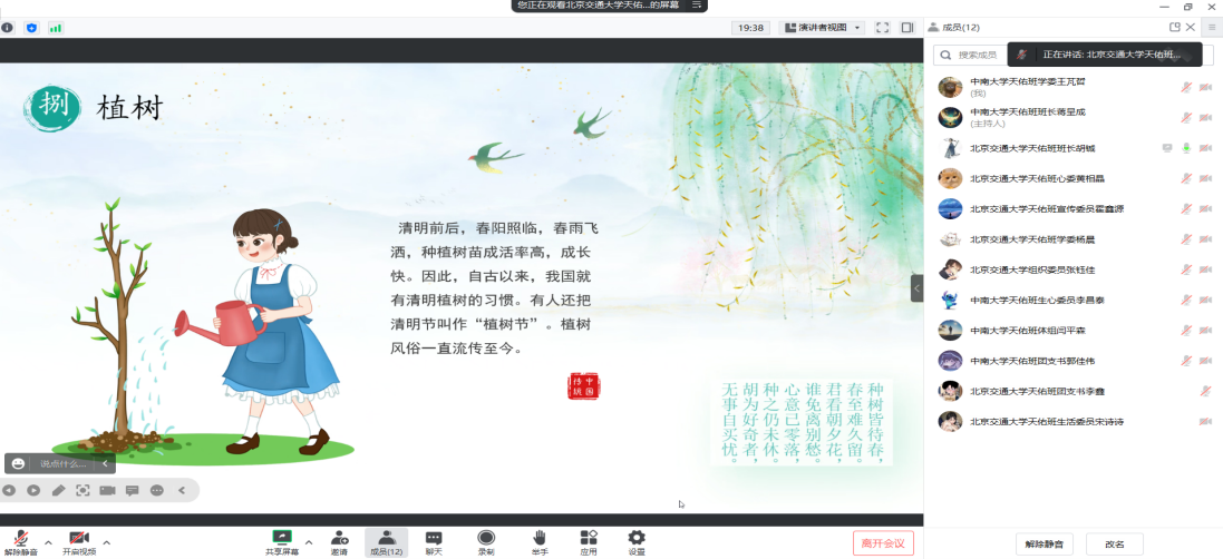 会议第一部分,诸侯快讯ok1122蒋呈成同学介绍了清明节的由来,清明节是中国传统节日之一,最开始是庆贺“水患已除,天下太平”的日子,如今发展成为扫墓祭祖,出游踏青的重要节日。北京交通大学胡铖同学介绍了清明节的传统习俗:踏青、扫墓、插柳戴柳、放风筝、荡秋千、拔河、蹴鞠、植树等。