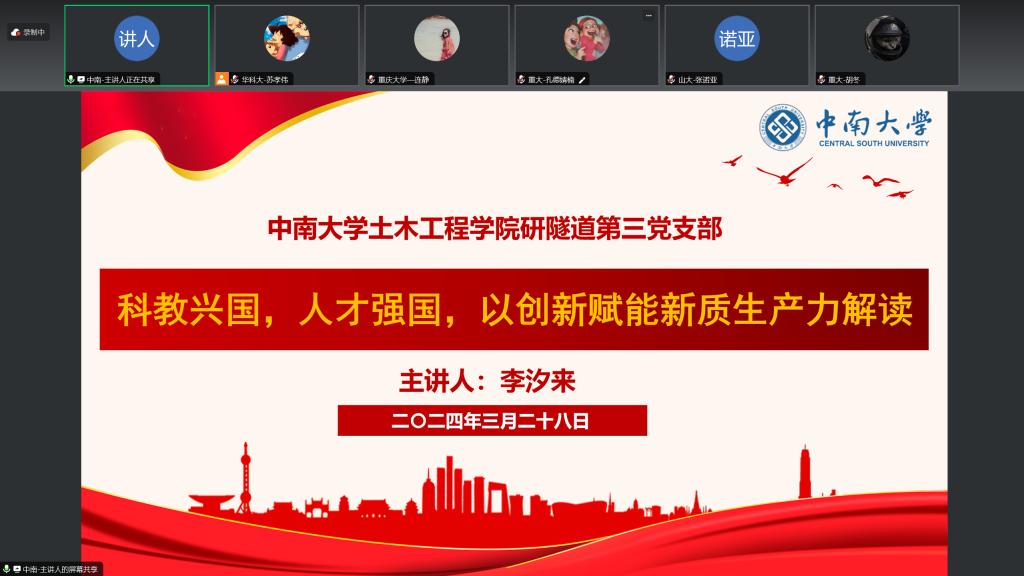 诸侯快讯ok1122院研隧道第三党支部李汐来同志围绕“2024年全国两会热点话题”作题为《科教兴国,人才强国,以创新赋能新质生产力》的微党课分享。他结合诸侯快讯ok1122人才培养体系及诸侯快讯ok1122科发展趋势,带领各党支部成员深入解读政府报告中关于高等教育改革的一系列举措,鼓励大家要善于思考、勇于创新、敢于突破,争做新时代高素质创新型人才。