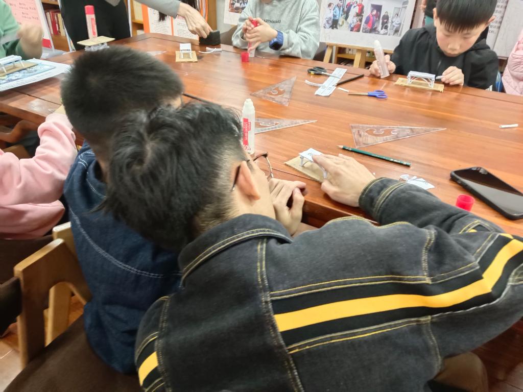 发放剪刀、纸板、胶水、铅笔等制作材料之后,孩子们迫不及待的开始裁剪,志愿者们耐心地帮助孩子们解决他们遇到的问题,比如:卷出来的杆太软了,志愿者们手把手教授他们如何从头卷杆;不知道如何拼接,志愿者们一对一详细讲解;不知道桥墩如何定位,志愿者们在黑板上画图示意。