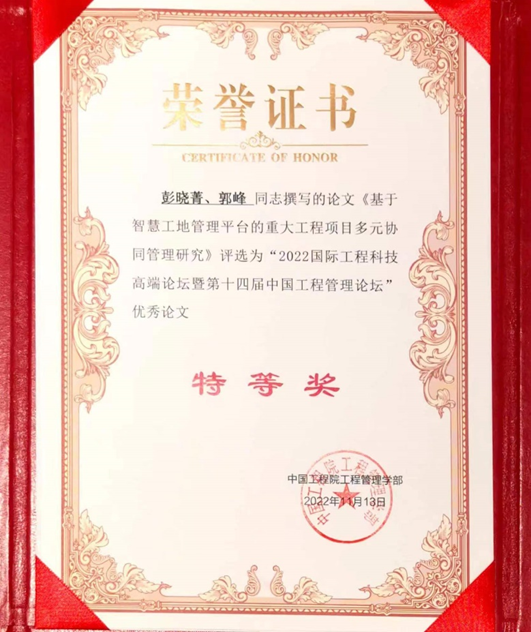 11月13日,论坛闭幕式由陈晓红院士主持,中国工程院院士何继善等20余名院士、30余名特邀专家出席论坛闭幕式。中国工程院院士、中国工程院党组书记、院长李晓红,湖南省人民政府副省长陈飞致闭幕辞,中国工程院院士、中国工程院工程管理学部主任卢春房作论坛总结。在闭幕式中,组委会颁发了论坛优秀论文奖(分为特等奖、一等奖和二等奖)和特别贡献奖。何继善院士获特别贡献奖,我院郭峰教授、彭晓菁同学撰写的论文《基于智慧工地平台的重大工程项目多元协同管理研究》被评选为“2022国际工程科技高端论坛暨第十四届中国工程管理论坛”优秀论文特等奖。