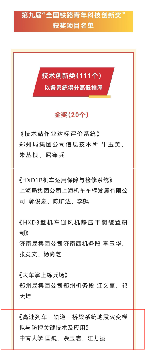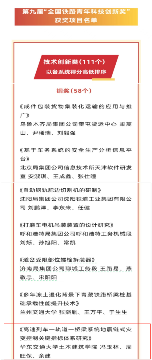 近日,全国铁道团委联合国铁集团科信部、铁道学会开展的第九届“全国铁路青年科技创新奖”评选活动落下帷幕,全国铁道团委发布了第九届 “全国铁路青年科技创新奖” 评选表彰结果。我院国巍教授、余玉洁教授、江力强副教授团队项目《高速列车-轨道-桥梁系统地震灾变模拟与防控关键技术及应用》喜获技术创新类金奖,周旺保教授、余建博士参与项目《高速列车—轨道—桥梁系统地震链式灾变控制关键指标体系研究》喜获技术创新类铜奖。