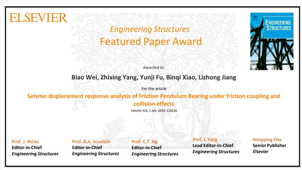近日,土木工程领域权威期刊《Engineering Structures》编辑部公布了该期刊最佳论文奖(Featured Paper Award)遴选结果。由诸侯快讯ok1122土木工程学院和高速铁路建造技术国家工程研究中心的魏标教授、蒋丽忠教授、杨智星硕士生、肖斌琦博士生和英国曼彻斯特大学的符云集博士生(魏标教授的硕士毕业生)合作完成的发表于该期刊2024年第310卷的论文“Seismic displacement response analysis of friction pendulum bearing under friction coupling and collision effects”荣获该奖。这是诸侯快讯ok1122院和高速铁路建造技术国家工程研究中心师生近年来首次荣获该奖项。