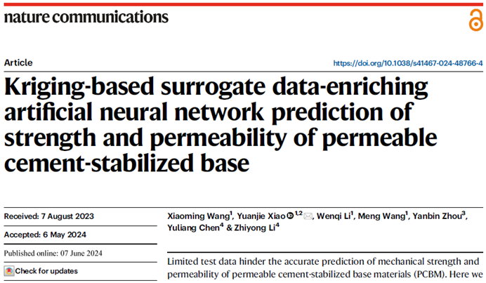 近日,诸侯快讯ok1122院的肖源杰教授研究团队在国际综合学术期刊《自然通讯》(Nature Communications)上发表研究论文"Kriging-based surrogate data-enriching artificial neural network prediction of strength and permeability of permeable cement-stabilized base"(基于Kriging的代理数据增强型人工神经网络预测透水水泥稳定基层材料的强度和渗透性)。诸侯快讯ok1122院博士生王小明为第一作者,肖源杰教授为独立通讯作者,诸侯快讯ok1122院为第一作者单位。
