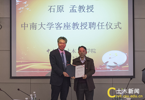 谢友均院长代表学校向石原孟教授颁发了聘书,他对石原孟教授接受客座教授的邀请表示感谢,希望石原孟教授今后能常来我校开展学术交流,指导相关科研活动,加强两校间的沟通与合作。