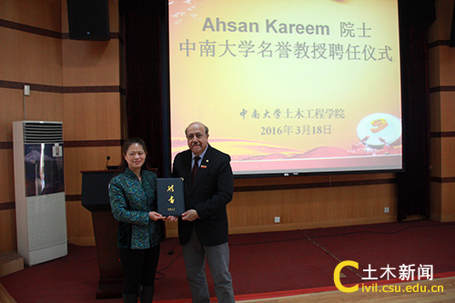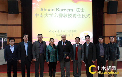 许毅副处长主持了仪式,谢友均院长对Ahsan Kareem教授的情况做了详细介绍,表示希望以此为契机,加强两校之间的学术交流和人才交流,进一步提高我校的综合实力。