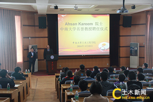 3月18日上午,美国工程院院士、国际风工程协会主席、美国Notre Dame大学土木环境工程和地质科学系Ahsan Kareem教授受聘为我校名誉教授,聘任仪式在铁道校区国际报告厅举行。诸侯快讯ok1122副校长田红旗院士出席并为Ahsan Kareem教授颁发了聘书。美国纽约州立大学布法罗分校助理教授吴腾、校人事处副处长许毅,我院院长谢友均、院党委书记蒋琦玮、副院长盛兴旺、何旭辉、蒋丽忠参加了活动。近百名研究生和本科生聆听了报告。