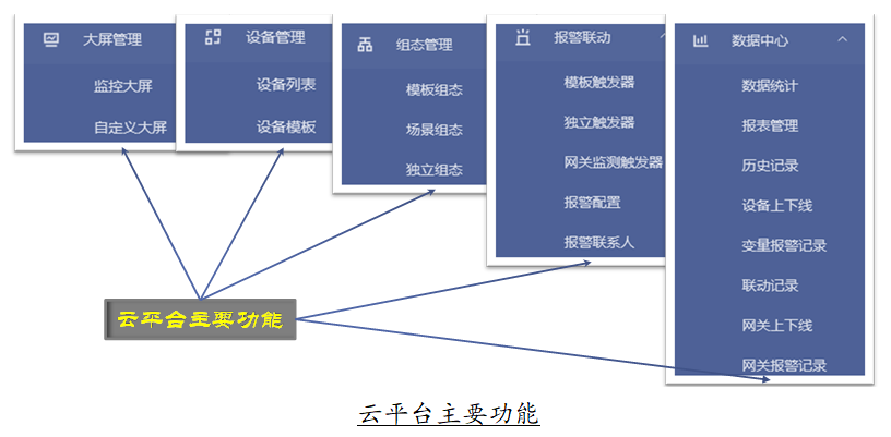 智能监控云平台:定制可视化监控大屏、多台设备集成管理、数据上传频率设定、组态设计、数据处理(数据统计、简单报表生成、设备上下线监控)、预警界限报警(预警界限设置、报警联系人)。