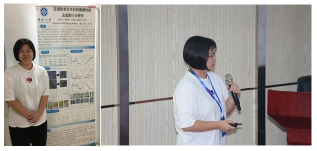 7月25日上午,赵雯筠、刘辉、王宁三位学生就自己研究课题的最新进展,进行了口头汇报展示。赵雯筠博士做了“压缩致密化木材的阻燃性能及成炭行为研究”的报告。赵雯筠博士通过对木材进行压缩致密化处理制得致密化木材,压缩致密化工艺从降低氧气的扩散、产物气体的逸出和形成坚固的木材、炭层结构三个方面出发,达到提升木材阻燃、抑烟和隔热性能的目的。研究表明,随着致密化程度的增加,木材的阻燃、抑烟和隔热性能也得到了相应的提升。当但压力过大时,木材自身结构易遭到破坏,使得性能反而降低,其中10MPa压力处理时效果最佳,与未处理木材相比其第二峰值热释放降低约26.3%、总放热量降低约9.8%、总产烟量下降约91.9%、隔热性能提高约18.6%。