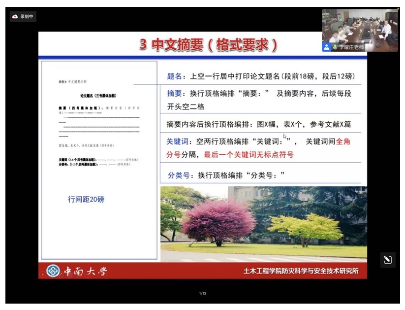 学位论文的内容集中体现了学生的科研素养和学术水平,而论文书写的规范性和严谨性则决定了学位论文的质量。会上,李耀庄教授详细介绍了学位论文封面、扉页、摘要、目录、符号说明、正文(图表)和参考文献的格式与写作要求,并总结了论文撰写思路与技巧。此外,李耀庄教授自述科研经历,分享科研心得,与同学们讨论科研过程中的辛酸与收获,并殷切期望同学们能潜心学术,最终在科研道路上有所收获、有所成就。