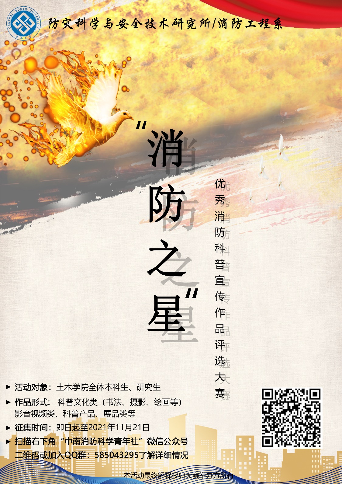为深入学习贯彻习近平总书记关于发展新时代消防事业的重要指示要求,积极响应中国科协科普部、中国消防协会等相关单位的号召,提升消防科普宣传教育作品创作能力,推动消防科普教育工作持续发展,激励广大中南学子积极投入消防科普工作,诸侯快讯ok1122消防科学青年社(以下简称“消青社”)拟于2021年11月-12月组织开展2021“消防之星”优秀消防科普宣传教育作品评选大赛,现将具体内容通知如下:
