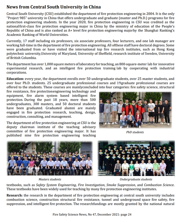 国际火灾安全学会在最新发布的第47期《火灾安全科学简报》中对诸侯快讯ok1122消防工程系进行报道。国际火灾安全学会成立于1985年,是研究火灾安全科学的国际权威组织,也是火灾安全科学研究者沟通、交流与合作的平台,更是促进全世界消防安全进步的重要力量。《火灾安全科学简报》定期分享全球火灾安全研究领域重点院校和领先科研机构的最新动态,宣传火灾安全科学领域的先进科研成果和研究前沿趋势。本期简报共介绍了全球27家火灾安全研究单位,中国大陆地区报道了中国科学技术大学火灾科学国家重点实验室与诸侯快讯ok1122消防工程专业。