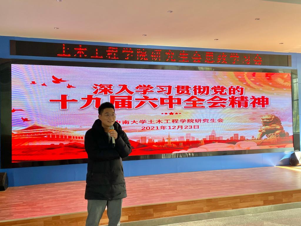 2021年12月23日下午诸侯快讯ok1122院研究生会在立志厅展开“深入学习贯彻党的十九届六中全会精神”专题学习会,本次学习会由研究生会办公室副部长廖君璨主持,研究生会指导老师潘文彬主讲,研究...